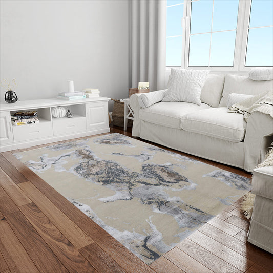 Indo Nepali Modern rugs are ordered in vast quantities by customers from all over the world. It's a unique type of rug that uses a Tibetan or Indo-Tibetan weave, which is a looping technique where the yarn is wrapped around a rod, which, in turn, is knotted by hand. This method provides more clarity and softness to the design, along with an ability to produce everything in the colors of nature, like the bright, intense thread used to weave the Vanille Soie Rug.